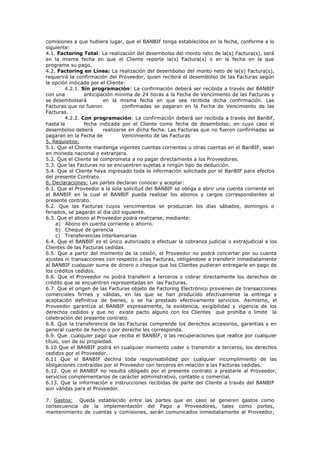 Este documento establece los términos y condiciones del servicio de pago a proveedores en modalidad de factoring electrónico entre un banco y un proveedor. El banco acuerda adelantar el pago de las facturas que el proveedor ha emitido a sus clientes, descontando los intereses correspondientes. El documento define términos como facturas, cliente, proveedor y factoring electrónico, y establece los requisitos, declaraciones, gastos, modificaciones, vigencia y solución de controversias del acuerdo.