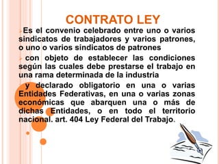 El documento describe el contrato ley, incluyendo su definición, cómo se crea y los pasos para establecer uno. Un contrato ley es un acuerdo entre sindicatos y empleadores que establece las condiciones laborales en una industria y puede hacerse obligatorio a nivel nacional, estatal o regional. Se crea mediante negociaciones entre sindicatos y patrones y debe ser aprobado por autoridades gubernamentales.