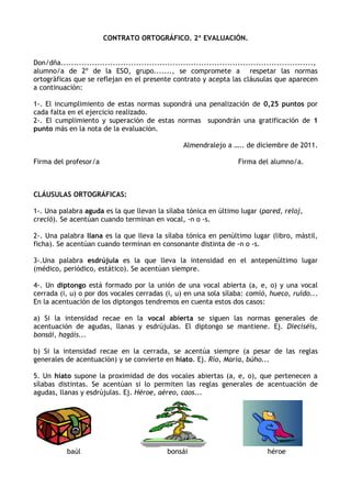 Este documento presenta un contrato ortográfico para la evaluación de un alumno de 2o de la ESO. El contrato establece penalizaciones por faltas ortográficas y una bonificación por cumplir las normas. Luego enumera cinco cláusulas ortográficas sobre la acentuación de palabras agudas, llanas, esdrújulas, diptongos e hiatos.