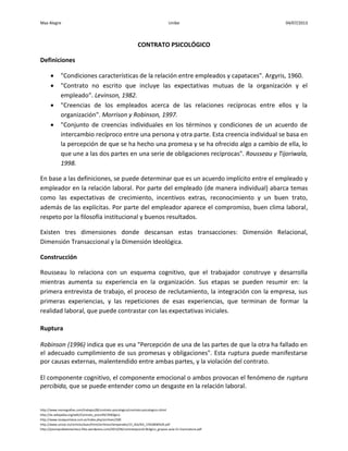 El documento define el contrato psicológico como un acuerdo implícito entre el empleado y el empleador sobre las expectativas de cada parte en la relación laboral. Se construye a través de las experiencias del empleado con la organización y puede romperse si una parte siente que la otra no ha cumplido con sus promesas u obligaciones.