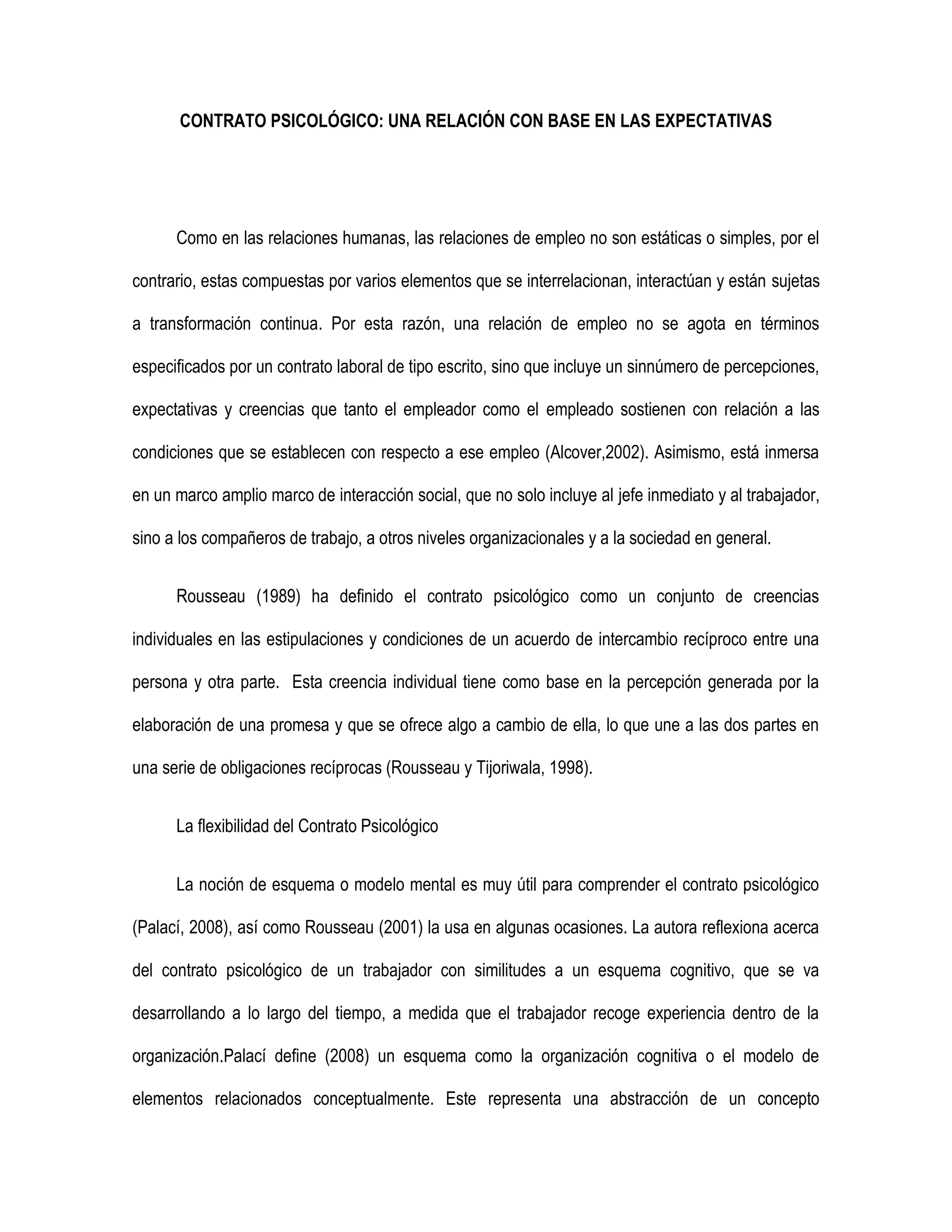 El documento describe el contrato psicológico como un conjunto de expectativas y creencias mutuas entre empleados y empleadores más allá de lo establecido en un contrato escrito. Define sus componentes principales como intercambios relacionales basados en la confianza a largo plazo o transaccionales centrados en beneficios inmediatos. Explica que el contrato psicológico se forma a través de esquemas mentales que evolucionan con la experiencia y son dinámicos y flexibles al cambio.