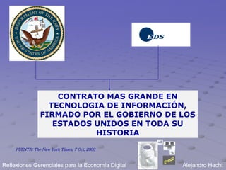 El documento describe el contrato más grande de tecnología de la información jamás firmado por el gobierno de Estados Unidos. El contrato involucra la construcción y mantenimiento de una intranet para el Departamento de Defensa de EE. UU. en 300 bases, a un costo de $50 mil millones durante cinco años. Este contrato representa un cambio importante hacia las mejores prácticas comerciales y el comercio electrónico para ahorrar costos y mejorar la capacidad defensiva.