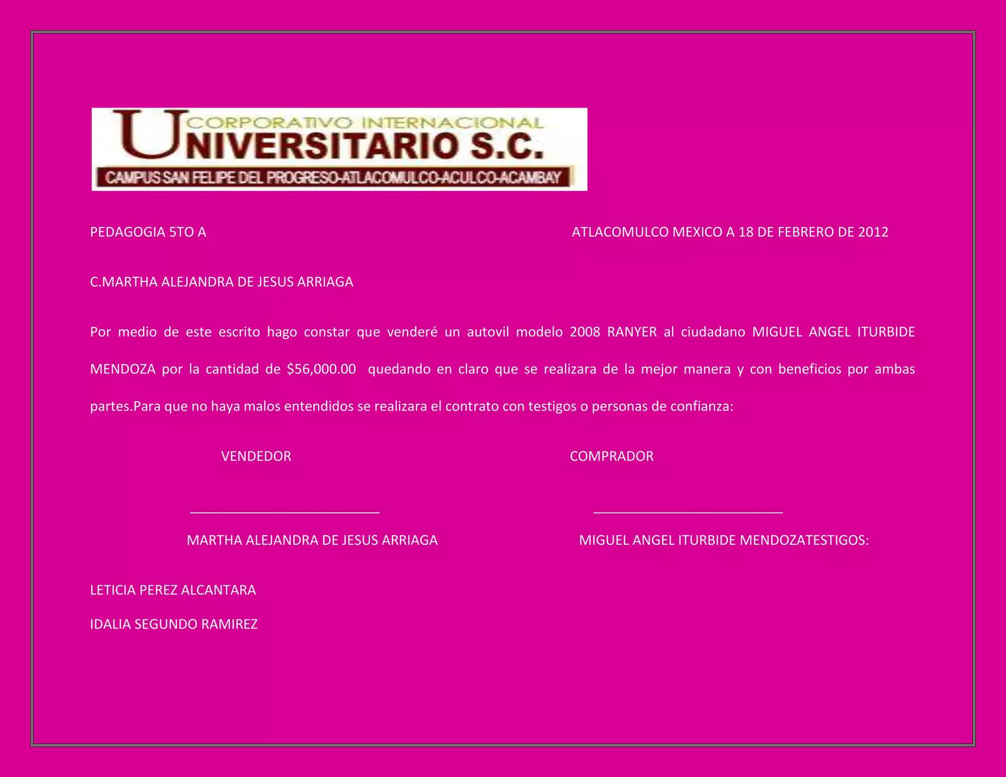 El documento es un contrato de venta de un automóvil modelo 2008 entre Martha Alejandra de Jesús Arriaga y Miguel Ángel Iturbide Mendoza por $56,000. El contrato estipula que la venta se realizará de manera justa y con beneficios para ambas partes, y contará con testigos para evitar malos entendidos.