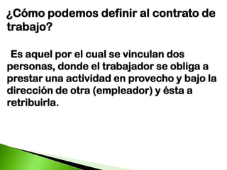 El documento define el contrato de trabajo como un acuerdo entre un trabajador y empleador donde el trabajador se compromete a prestar sus servicios bajo la dirección del empleador a cambio de una remuneración. Explica que existen contratos típicos y atípicos, siendo los típicos aquellos regulados por la ley y los atípicos aquellos que no cumplen con las características de los típicos. Finalmente, resume las obligaciones fundamentales de los trabajadores como prestar sus servicios y obedecer al e