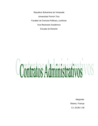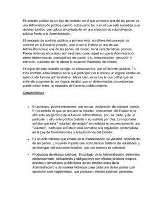 Este documento describe los elementos y características de los contratos públicos y administrativos en Venezuela. Explica que un contrato público es aquel en el que al menos una de las partes es una administración pública. Los elementos esenciales de cualquier contrato son los sujetos, el consentimiento, el objeto y la causa. El contrato de obra pública es el contrato administrativo por excelencia, mediante el cual una administración pública encarga a un contratista privado la ejecución de una obra a cambio de un pago.