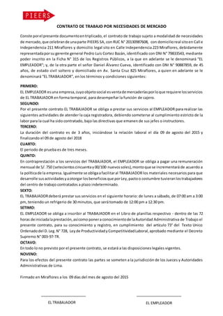 El documento presenta varios contratos de trabajo celebrados entre diferentes empleadores y trabajadores, detallando condiciones como duración, remuneración y funciones específicas. Cada contrato especifica los derechos y obligaciones de ambas partes, así como la legislación aplicable y el proceso de registro ante la autoridad laboral. Todos los contratos están sujetos a períodos de prueba y son firmados por las partes involucradas.