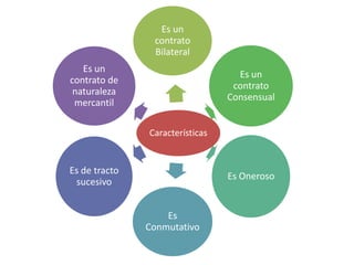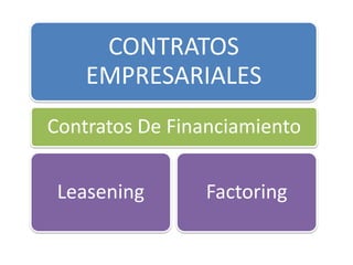 Este documento discute varios tipos de contratos empresariales, incluyendo contratos de leasing, arrendamiento, y factoreo. Explica los fundamentos legales de estos acuerdos comerciales, las partes involucradas, y los procedimientos para el pago y uso de activos cubiertos por estos contratos.