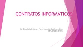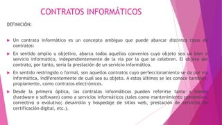 Este documento define los contratos informáticos y describe sus características principales. Explica que un contrato informático puede referirse a bienes o servicios informáticos y que su naturaleza jurídica es mixta. También describe los tipos de partes, obligaciones, tipos de contratos informáticos comunes como la compraventa y riesgos como la falta de seguridad.