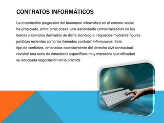Los contratos informáticos regulan la comercialización de bienes y servicios tecnológicos y presentan características específicas que dificultan su negociación. Estos contratos merecen un análisis detallado de sus implicaciones legales para establecer un régimen jurídico aplicable. También conllevan riesgos informáticos que generan pérdidas económicas, por lo que se justifica un estudio particular con medidas preventivas y de seguros informáticos.