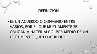 El documento define un contrato mercantil como un acuerdo entre partes para obligarse mutuamente a realizar algo mediante un documento. Explica que un contrato mercantil incluye elementos personales (vendedor y comprador), elementos reales (cosa y precio) y elementos formales que varían según el bien enajenado. También enumera diversos tipos de contratos y señala que la ley y la costumbre son las principales fuentes de los contratos mercantiles.