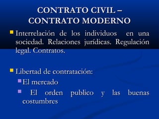 1) El documento habla sobre los contratos modernos y específicamente sobre el contrato de tarjeta de crédito. 2) Explica los orígenes y evolución del contrato de tarjeta de crédito desde inicios del siglo XX. 3) Define el contrato de tarjeta de crédito como una relación jurídica compleja entre un usuario, una entidad emisora y establecimientos afiliados.