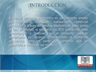 Este documento discute la contratación y aplicación de contratos en el comercio electrónico. Explica que el comercio electrónico puede referirse a cualquier transacción comercial electrónica, pero aquí se limita a las transacciones a través de redes. También distingue entre comercio electrónico directo e indirecto. Luego, describe que un contrato electrónico se forma a través del intercambio de oferta y aceptación en línea, y que estos contratos son vinculantes y están regulados por las leyes civiles y mercantiles