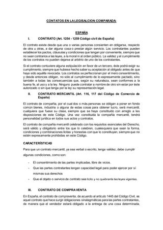 1) El documento describe las regulaciones de los contratos en las legislaciones de España, Italia e Inglaterra. 2) En España, los contratos mercantiles se rigen principalmente por el Código de Comercio, mientras que los contratos civiles se rigen por el Código Civil. 3) En Italia, el derecho comercial está incorporado en el derecho civil en el Código Civil Unificado de 1942. Los contratos mercantiles se rigen principalmente por analogía con otros contratos similares. 4) En Inglaterra, el contrato se define como un acuerdo entre
