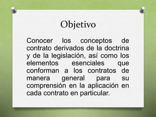 El documento aborda los contratos, su definición y elementos esenciales según la doctrina y legislación, enfatizando su importancia en la vida cotidiana. Se describen distintos tipos de contratos que las personas celebran regularmente, como transporte y compraventa, así como el proceso de perfeccionamiento y características de los contratos como actos jurídicos. Además, se incluye un ejercicio propuesto para estudiar los conceptos de contrato y sus fuentes.