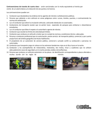 Las contravenciones de tránsito de cuarta clase serán sancionadas con una multa equivalente al 30% de un salario básico y la reducción de 6 puntos a la licencia. Estas contravenciones incluyen desobedecer órdenes de agentes de tránsito, adelantar vehículos de manera peligrosa, alterar la circulación vehicular, transportar carga sin banderines o luces, y conducir vehículos sin placas de identificación adecuadas.