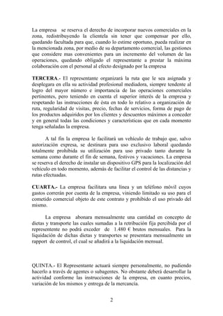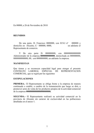 Este documento es un contrato laboral entre un representante de comercio y una empresa. El representante promoverá la venta de productos de la empresa en la provincia de Alicante. Recibirá un salario fijo mensual de 1.200€ netos más comisiones por ventas realizadas. También puede ganar bonos trimestrales por alcanzar objetivos de ventas. El representante usará un vehículo y teléfono móvil facilitados por la empresa exclusivamente para propósitos comerciales. El contrato dura inicialmente 6 meses y es prorrogable