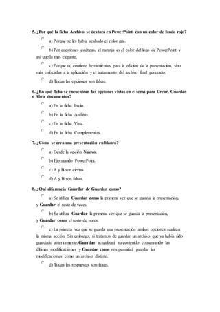 Este documento contiene 10 evaluaciones sobre conceptos y herramientas básicas de PowerPoint. Cada evaluación consta de 10 preguntas de opción múltiple sobre temas como la barra de herramientas, vistas, trabajo con diapositivas, objetos, diseño, texto y notas del orador. El documento evalúa los conocimientos fundamentales necesarios para utilizar PowerPoint de forma efectiva.