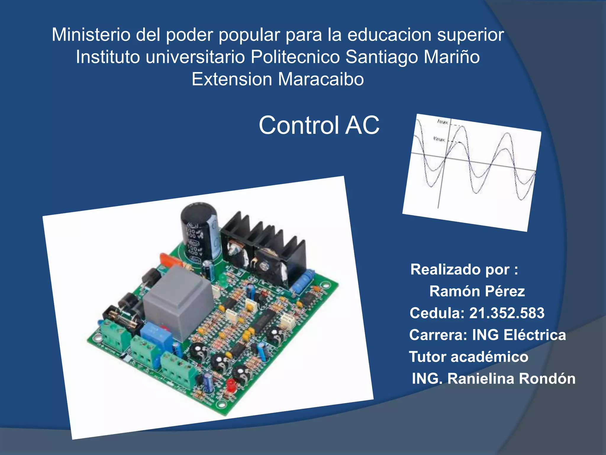 Este documento describe tres tipos principales de controladores de variadores de frecuencia AC: 1) voltaje de entrada variable, 2) inversor fuente de corriente, y 3) modulación por ancho de pulso. Explica cómo cada uno logra controlar la velocidad del motor variando el voltaje y frecuencia de alimentación del motor. También cubre temas como controladores trifásicos, control de ángulo de fase, y diseños de circuitos de control de velocidad para motores AC y DC.