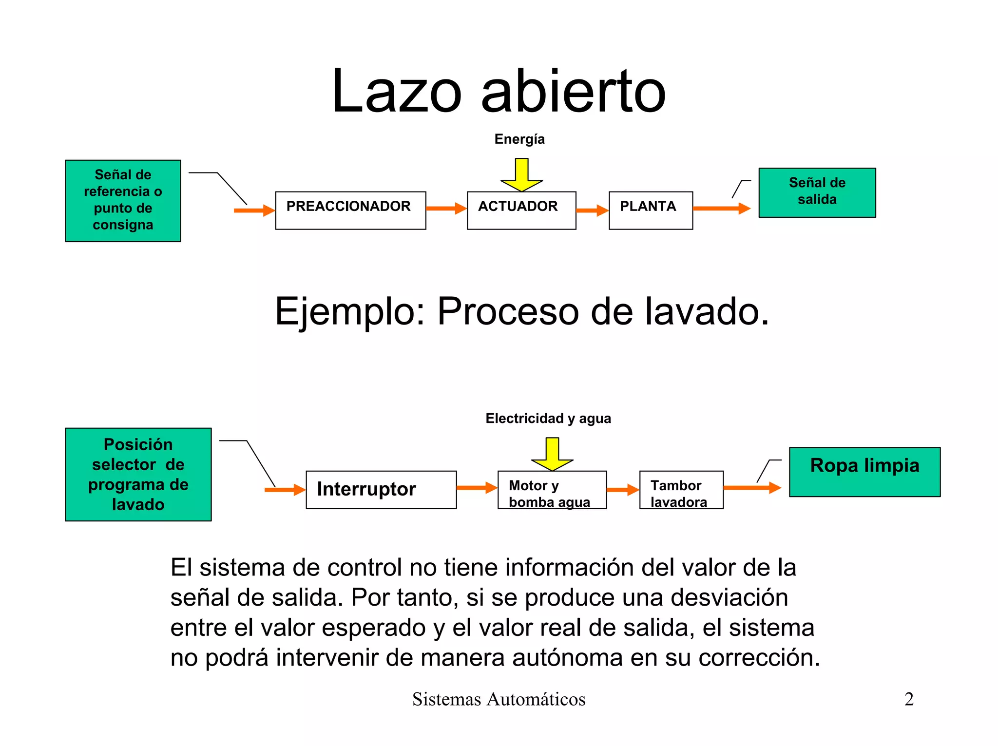 El documento describe los componentes básicos de un sistema de control automático, incluyendo el preaccionador, actuador, planta, regulador, detector de error y transductor. Explica cómo funcionan los lazos abiertos y cerrados, y proporciona ejemplos de cómo se usan estos sistemas para controlar procesos como la iluminación, lavado y temperatura.