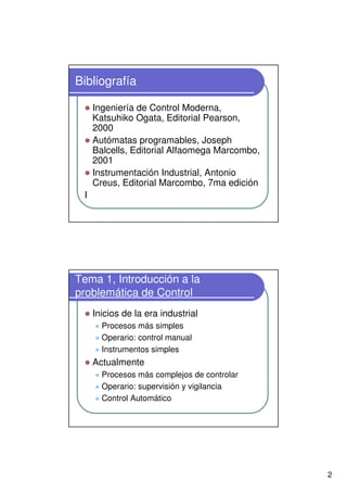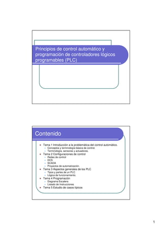 Este documento presenta los principios básicos del control automático y la programación de controladores lógicos programables (PLC). Cubre temas como conceptos de control, configuraciones de control, aspectos generales de los PLC, programación, y estudios de casos típicos. El control automático es crucial para lograr productos de mayor calidad, minimizar desperdicios, proteger el medio ambiente y mejorar el rendimiento de los procesos industriales.