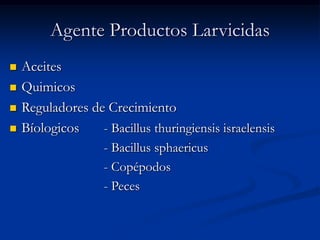 Este documento describe diferentes métodos de control biológico de mosquitos, incluyendo el uso de bacterias como Bacillus thuringiensis israelensis y Bacillus sphaericus, así como copépodos y peces. Se enfoca en el producto Vectolex, el cual contiene Bacillus sphaericus. Vectolex actúa cuando las larvas de mosquito ingieren sus esporas y cristales, los cuales liberan una toxina que mata a la larva. Tiene un efecto residual prolongado debido a la reproducción de la bacteria dentro de los cadáver