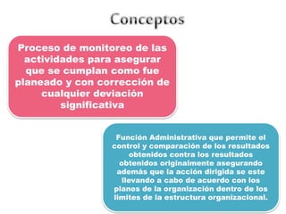 Este documento describe el proceso de monitoreo y control. Explica que el control es una función administrativa que permite comparar los resultados reales con los planes originales y asegurar que las acciones se lleven a cabo según lo planeado. También detalla los cuatro pasos del proceso de control: establecimiento de estándares, medición del desempeño, comparación con los estándares y acción administrativa. Finalmente, ofrece recomendaciones para la aplicación efectiva del control, como distinguir los pasos clave y asegurar que los sistemas de control se