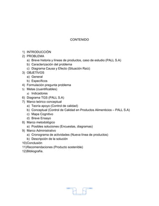 Este documento presenta un resumen de la situación actual de Productos Alimenticios La Locura PALL S.A. Se identifica una disminución en las ventas debido a fallas en la infraestructura de los puntos de venta y capacitación deficiente del personal. Se propone certificar a PALL S.A. en normas de calidad, mejorar los puntos de venta, e implementar un programa de capacitación para el personal para mejorar la experiencia del cliente.