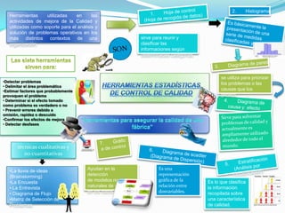 El documento presenta información sobre herramientas utilizadas para mejorar la calidad y solucionar problemas operativos en organizaciones. Menciona técnicas como la lluvia de ideas, encuestas, entrevistas, diagramas de flujo y matrices de selección de problemas que ayudan a detectar problemas y delimitar el área problemática. También describe herramientas como el diagrama de Pareto y el histograma que clasifican la información y permiten priorizar problemas y sus causas.