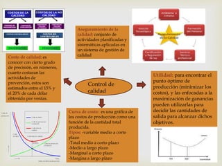 Este documento presenta información sobre aseguramiento de calidad y costos de calidad. Explica que el aseguramiento de calidad involucra actividades planificadas para gestionar la calidad y que el costo de calidad estima el costo de prevención entre 15-20% de las ventas. También describe curvas de costos que muestran los costos de producción en relación a la cantidad producida y sus tipos, e indica que las curvas de costo son útiles para minimizar costos y maximizar ganancias.