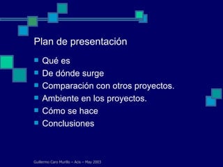 El documento explica el concepto de control de cambios en proyectos. Define control de cambios como la comprobación e inspección de cambios en un proyecto para mantener el equilibrio entre las partes involucradas. Explica que los cambios surgen de imprecisiones contractuales y durante la ejecución del proyecto. Finalmente, recomienda establecer mecanismos de control de cambios desde el inicio del proyecto y usarlos con juicio para mantener la confianza y el equilibrio entre las partes.