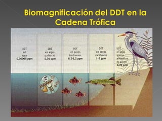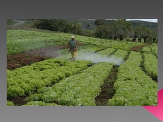 Este documento trata sobre los pesticidas y su uso. Explica conceptos clave como la definición de pesticidas, sus causas de contaminación cuando son mal utilizados, y alternativas de solución como el control y vigilancia de su uso. También describe los diferentes tipos de pesticidas sintéticos, sus propiedades como la persistencia y toxicidad, y los efectos en la salud y el medio ambiente.