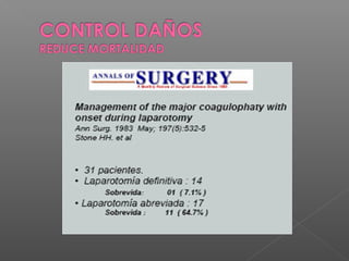 La laparotomía abreviada y el control de daños se han convertido en estrategias importantes para el manejo del trauma abdominal severo. Estas técnicas permiten controlar rápidamente la hemorragia y contaminación para luego estabilizar al paciente en la UCI antes de una reparación anatómica definitiva. Esto ha llevado a una reducción significativa de la mortalidad asociada a la triada de la muerte causada por acidosis, hipotermia y coagulopatía. Sin embargo, se requiere de un equipo multidisciplinario experto para implementar