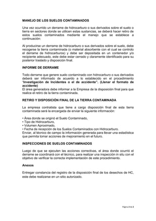 Este documento define los procedimientos para controlar derrames de hidrocarburos u otros derivados de petróleo y para disponer adecuadamente de los suelos contaminados accidentalmente. Establece que cualquier área que manipule estos productos debe reportar y limpiar cualquier derrame de acuerdo a este procedimiento, retirando el suelo contaminado y entregándolo a una empresa autorizada para su disposición final. También especifica potenciales lugares de derrames, el manejo adecuado del suelo contaminado y los informes requeridos.