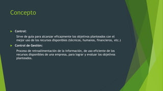 El control de gestión es un proceso que permite el uso eficiente de recursos para alcanzar y evaluar objetivos empresariales. Implica la planificación, coordinación y evaluación de actividades, adaptándose a factores como el entorno, la estructura organizacional y la cultura. Las responsabilidades del control incluyen establecer objetivos, medir el rendimiento y diseñar sistemas informativos que faciliten la toma de decisiones.