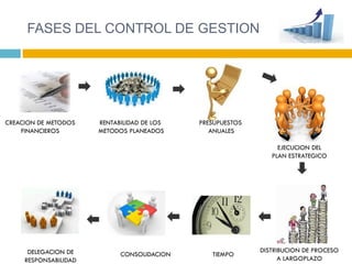 El documento describe las fases del control de gestión, incluyendo la creación de métodos financieros, la elaboración de presupuestos anuales, la medición de la rentabilidad de los métodos planeados, la distribución del proceso a largo plazo, la ejecución del plan estratégico y la consolidación de la delegación de responsabilidad.