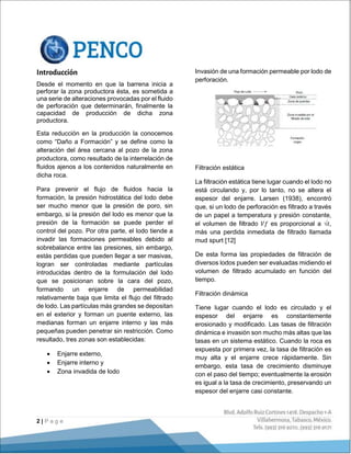 El documento detalla las pérdidas de filtrado durante la perforación de pozos y propone el uso de obturantes para mitigar el daño a la formación. Se presentan pruebas de laboratorio que evalúan diferentes combinaciones de obturantes, logrando un grado de invasión significativamente reducido en las muestras. El estudio concluye que ciertos obturantes pueden mejorar la contención del filtrado y preservar la permeabilidad del reservorio.