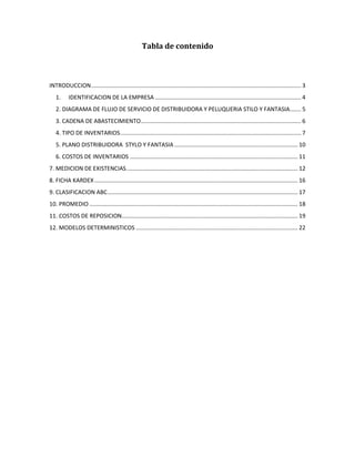 Este documento presenta información sobre el control de inventarios de una distribuidora y peluquería llamada Stylo y Fantasía. Incluye la identificación de la empresa, diagrama de flujo del servicio, tipos de inventarios, costos asociados, medición de existencias y clasificación ABC de productos. El objetivo es optimizar los inventarios para maximizar las utilidades de la empresa.