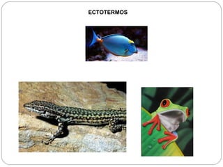 Este documento describe los mecanismos de homeostasis y control de la temperatura en organismos ectotermos y endotermos. Los ectotermos como los reptiles regulan su temperatura corporal mediante el intercambio de calor con el ambiente, mientras que los endotermos como los mamíferos generan calor internamente. Los humanos son endotermos que mantienen su temperatura corporal constante a través de centros de control en el cerebro y mecanismos como la termogénesis y la vasoconstricción/vasodilatación de los vasos sanguíneos.