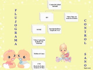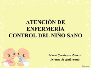 Este documento presenta los objetivos y actividades de enfermería para el control del niño sano. Su objetivo general es evaluar el crecimiento y desarrollo del niño para garantizar que sea normal. Entre sus objetivos específicos se encuentran contribuir al desarrollo integral del niño, detectar factores de riesgo, fomentar la lactancia materna y coordinar la atención del niño. Describe las actividades de enfermería como preparación, valoración, diagnósticos, indicaciones y calendario de vacunación. Finaliza detallando los
