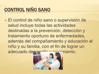 El documento describe el control de niño sano o supervisión de salud. Esto incluye actividades para la prevención, detección y tratamiento oportuno de enfermedades del niño, además del acompañamiento y educación del niño y su familia para lograr un adecuado desarrollo y crecimiento. Los controles de niño sano deben incluir evaluaciones médicas periódicas según la edad del niño, con el objetivo de monitorear su crecimiento y desarrollo de manera integral.