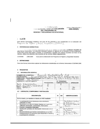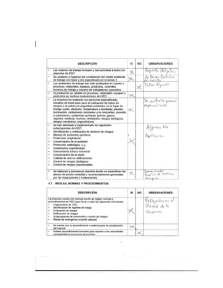 El documento resume la evaluación de los programas y políticas de seguridad de la empresa Bancale Mantenimiento C.A. Se realizó una auditoría de su programa de seguridad y salud ocupacional según la norma COVENIN 2266:2005, encontrando que la empresa cuenta con controles básicos pero necesita reforzar áreas como el estudio y seguimiento de accidentes y enfermedades laborales, y contratar un médico ocupacional. A pesar de tener un departamento de seguridad, se deben mejorar los programas de capacitación y cubrir todos los