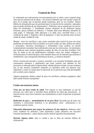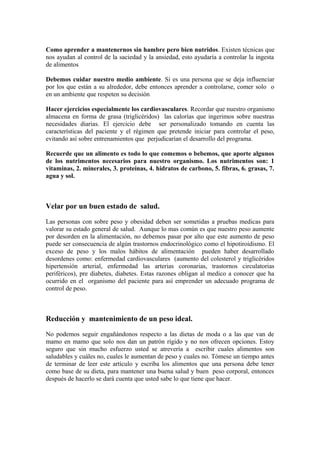 1) Es importante educarse sobre hábitos alimenticios saludables para mantener un peso saludable de forma sostenible, en lugar de dietas estrictas que solo funcionan a corto plazo. 2) Las personas con sobrepeso deben someterse a exámenes médicos para evaluar su salud general y identificar cualquier problema subyacente. 3) Una alimentación balanceada que incluya los principales grupos de alimentos en las porciones adecuadas es la clave para perder peso gradualmente y mantenerlo.