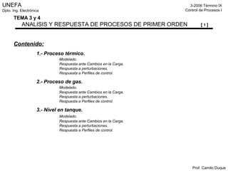 El documento describe tres procesos de primer orden: un proceso térmico, un proceso de gas y un nivel en tanque. Se presenta el modelado matemático de cada proceso usando balances de masa y energía. Se explica que cada proceso puede ser representado por una ecuación diferencial de primer orden y se analiza su comportamiento ante cambios en la carga, perturbaciones y perfiles de control.