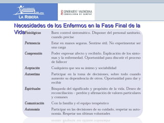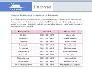 El documento describe los principios generales del control de síntomas en pacientes terminales. El dolor, la astenia y la anorexia son los síntomas más comunes, apareciendo en más del 70% de los pacientes. Un enfoque efectivo requiere una evaluación individualizada, el uso de escalas para medir síntomas como la ESAS, y un tratamiento combinado y adaptado que considere las preferencias del paciente.