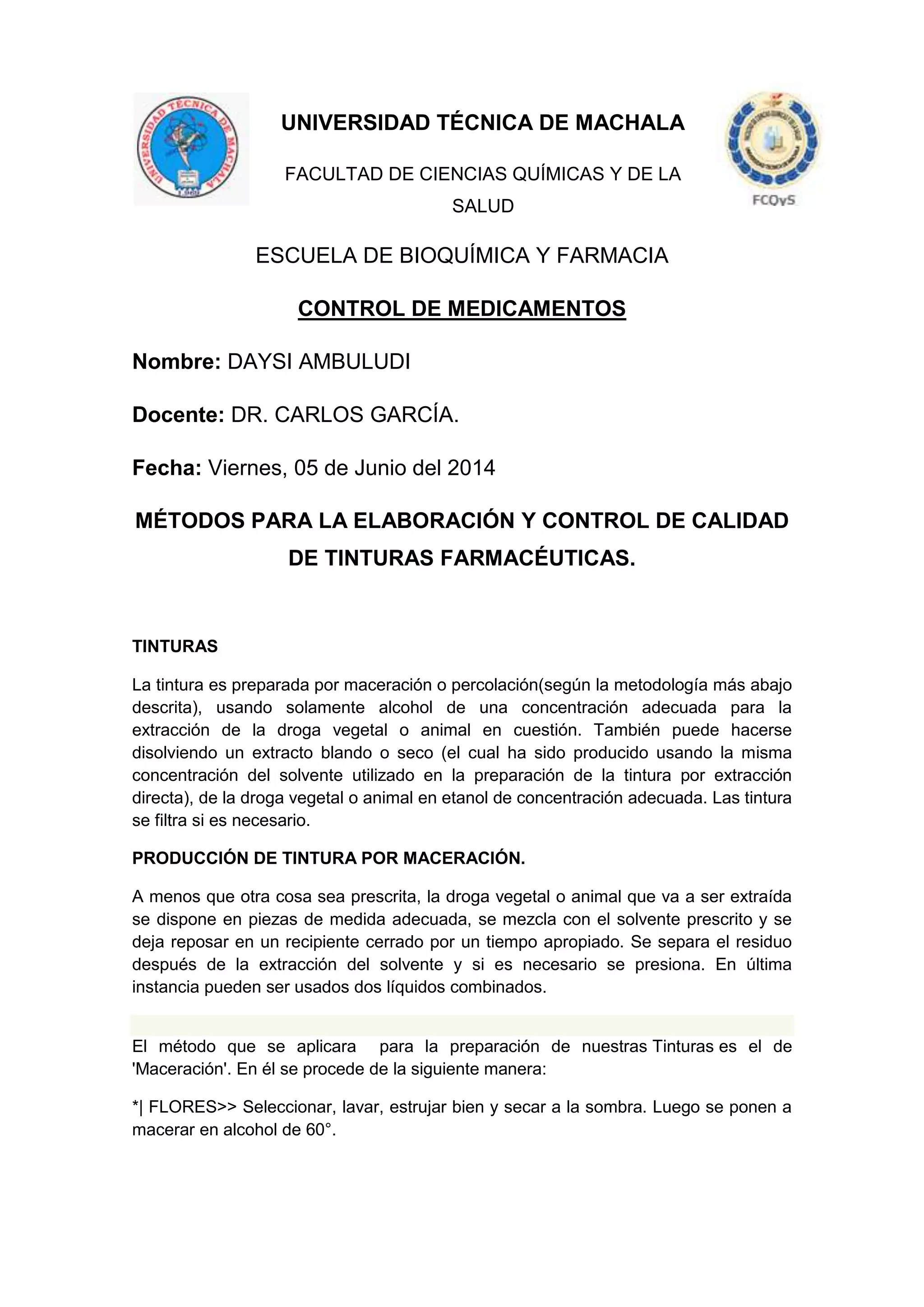 Este documento describe los métodos para la elaboración y control de calidad de tinturas farmacéuticas. Explica los procesos de maceración y percolación para producir tinturas a partir de plantas, y los pasos para realizar controles de calidad incluyendo pruebas organolépticas, de pH, índice de refracción y densidad. También presenta los resultados del control de calidad de una tintura de Passiflora incarnata y otra de Ítamo Real.