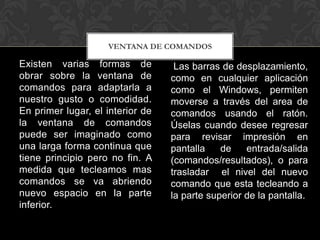 La ventana de comandos de Matlab puede verse como una forma continua que se expande a medida que se ingresan más comandos. Las barras de desplazamiento permiten moverse hacia arriba y hacia aba para revisar comandos y resultados anteriores. El comando "clc" borra el contenido de la ventana, mientras que "format compact" reduce el espacio entre líneas para ahorrar espacio en pantalla.
