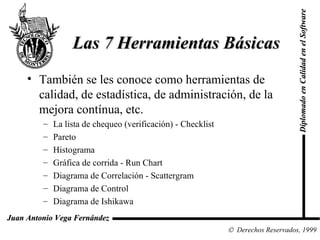 El documento describe las siete herramientas básicas de calidad, incluyendo la hoja de verificación, el diagrama de Pareto, el histograma, el diagrama de correlación, el diagrama de control, y el diagrama de Ishikawa. Estas herramientas se utilizan para organizar datos, facilitar la toma de decisiones, y mejorar los procesos mediante el análisis de problemas e identificación de causas. El documento también proporciona ejemplos y directrices sobre el uso apropiado de cada herramienta.