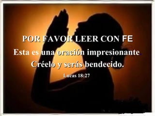 El documento habla sobre la fe en Dios y su fidelidad a sus promesas. Insta al lector a creer que Dios derramará bendiciones en su vida si tiene fe. Termina con una oración pidiendo bendiciones para el lector y todos aquellos a quienes compartan el mensaje.