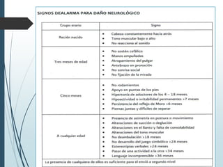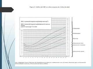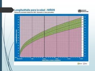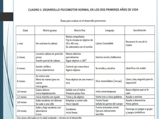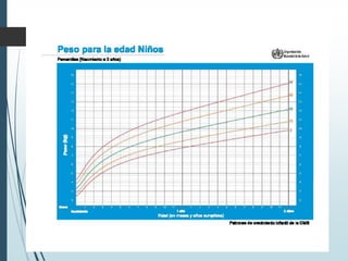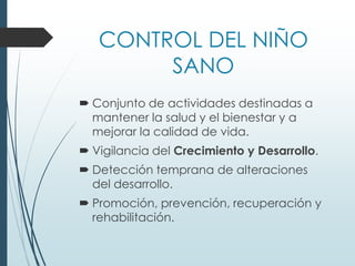Este documento describe los aspectos fundamentales del control del niño sano, incluyendo las consultas recomendadas según la edad, los parámetros que se evalúan en cada consulta como el crecimiento, desarrollo y vacunación, y los criterios de referencia al segundo nivel. Explica los conceptos clave de crecimiento como peso, talla, perímetro cefálico e IMC, así como las leyes y períodos del desarrollo psicomotor en la infancia.