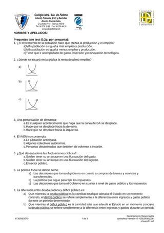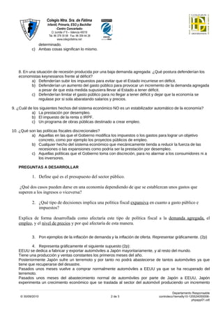 El documento contiene 10 preguntas de opción múltiple y 3 preguntas abiertas sobre temas económicos como el crecimiento de la población, la renta de pleno empleo, las perturbaciones de demanda, el INEM, las fluctuaciones cíclicas, la política fiscal, la diferencia entre deuda y déficit públicos, las posturas keynesianas frente al déficit, los estabilizadores automáticos, y las políticas fiscales discrecionales. También pide definir el presupuesto del sector público y representar gráficamente ejemp